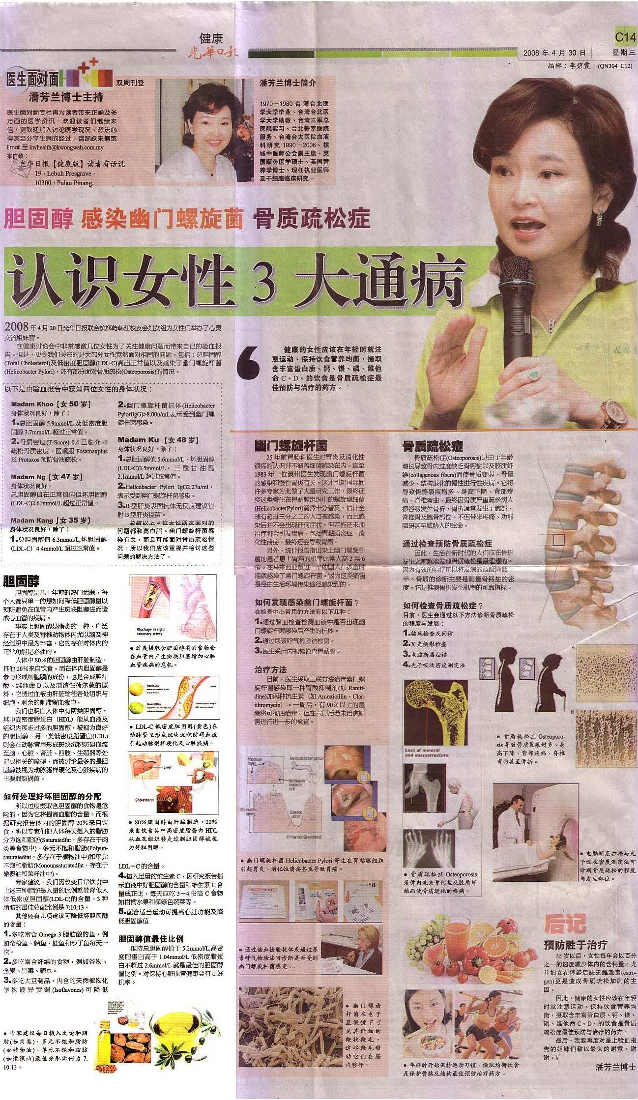 30/04/2008 - Understanding The 3 Common Problems of Women:Cholesterol / Infected with Helicobacter Pylori / Osteoporosis